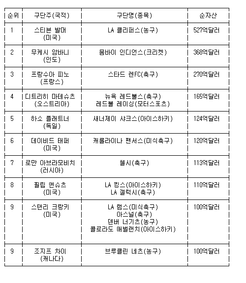 미국 경제 전문지 포브스는 8일(한국시간) 전 세계 스포츠 구단주들의 순자산 규모를 조사해 상위 20명을 발표했다.