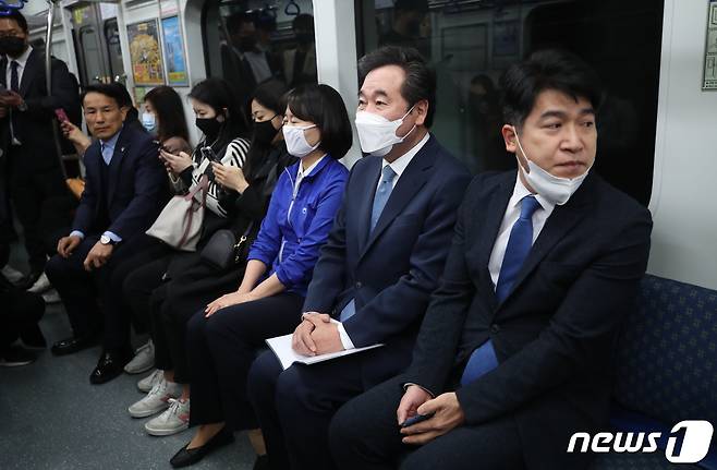 (부산=뉴스1) 임세영 기자 = 이낙연 더불어민주당 상임공동선대위원장이 8일 부산 지하철 남포역에서 지하철을 타고 서면역으로 이동하고 있다. 2020.4.8/뉴스1