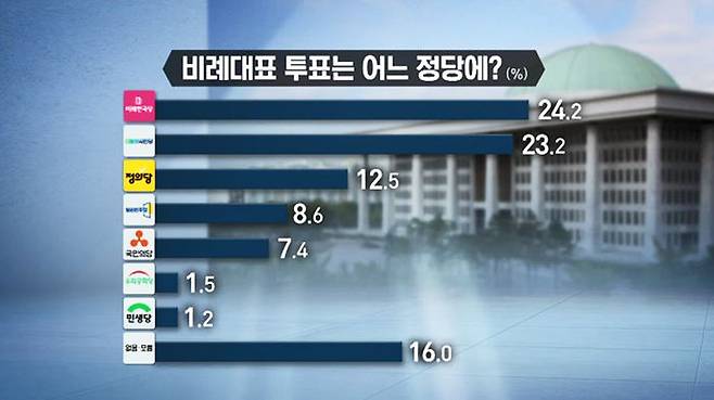 24.2%가 미래한국당, 23.2%가 더불어시민당이라고 응답해 두 당의 지지도가 1%p 차, 오차범위 안에 있는 것으로 조사됐습니다.