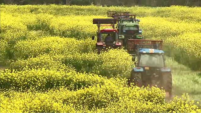 노랗게 펼쳐진 유채꽃밭을 트랙터 4대가 바쁘게 오갑니다.
