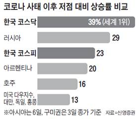 8일 신영증권에 따르면, 코로나 사태 이후 최저점 대비 상승률(아시아 6일·구미권 3일 종가 기준)은 코스닥지수가 39%로, 전 세계 주요국 대표 지수 가운데 1위였다. 러시아 RTS지수가 29%로 2위였고, 코스피지수도 23%로 3위에 올랐다.