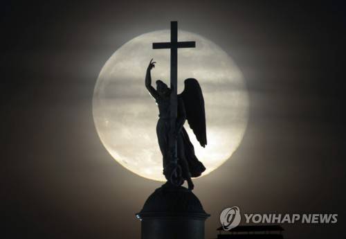 A statue of an angel fixed atop the Alexander Column at the Palace Square is silhouetted on the rising full moon in St.Petersburg, Russia, Wednesday, April 8, 2020. (AP Photo/Dmitri Lovetsky)