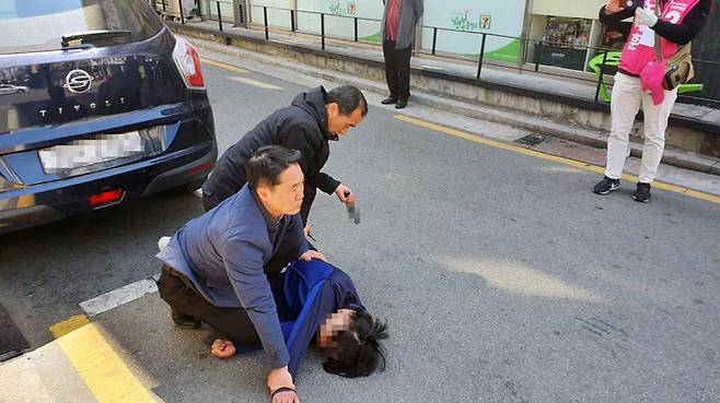 4·15 총선에 출마한 미래통합당 오세훈 후보(서울 광진을)의 유세 현장에서 흉기를 들고 접근해 난동을 부린 50대 남성이 경찰에 붙잡혔습니다.