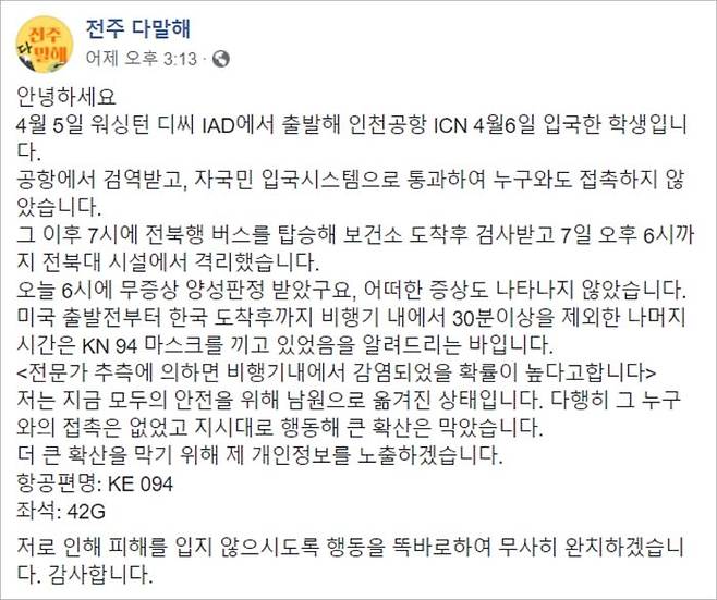 미국에서 입국한 전북지역 17번째 확진자인 21세 유학생 A 씨는 어제(8일) 전주 지역 소식을 전하는 '전주 다말해' 페이스북 페이지를 통해 미국에서 출국할 당시부터 우리나라에 입국해 코로나19 확진 판정을 받기까지의 과정을 상세하게 전했습니다.