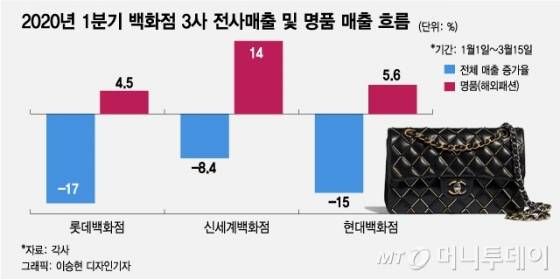 코로나19 사태로 백화점 내점객이 급감한 올해도 소비자들은 마스크 쓴 채 명품관에 줄 섰다. 1월1일부터 3월15일까지 롯데·신세계·현대 백화점 3사의 매출은 각각 17.1%, 8.4%, 15% 감소했으나 명품관은 4.5%, 14%, 5.6% 고성장을 이어갔다.