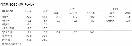 KB증권은 10일 테크윙(089030)에 대해 신종 코로나 바이러스 감염증(코로나19)을 비껴 간 올해 1분기 실적을 기록했다고 진단했다.