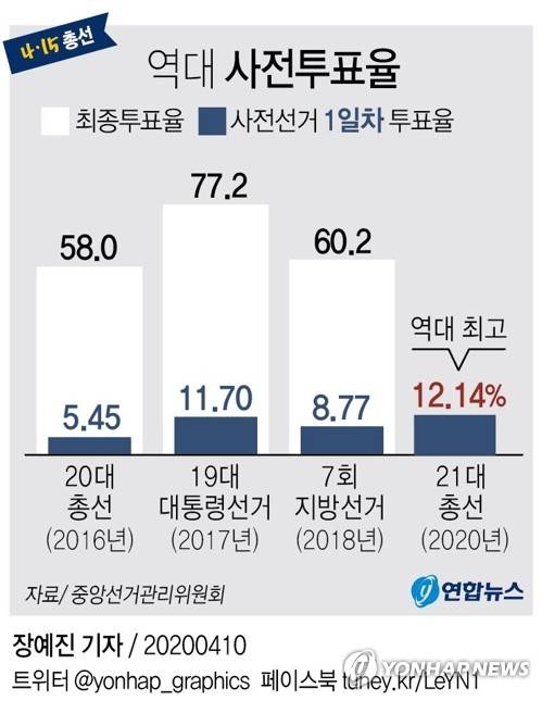 선관위 관계자는 연합뉴스와의 통화에서 "코로나19로 인한 분산투표 심리와 사전투표에 대한 유권자의 긍정적 인식이 작용한 결과로 보인다"면서 "하지만 이 결과로 전체 투표율 추세를 예단하긴 어려울 것"이라고 말했다.