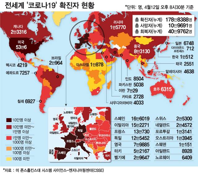 12일 한국시간 오후 8시30분 기준 미국 존스홉킨스대 통계에 따르면 전세계 코로나19 누적 확진자는 178만8388명을 기록했다. 사망자는 10만9691명, 회복자는 40만9762명으로 집계됐다.