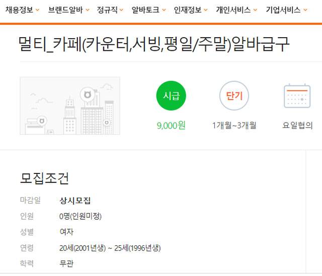 일단 허위 구인광고는 어떤 형태인지부터 살펴봤습니다. '멀티 카페'의 카운터·서빙 알바를 급구한다는 제목에 모집 대상 성별은 '여성', 연령은 '20세~25세'로 돼 있었습니다.