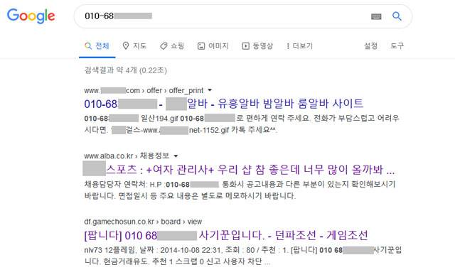 해당 번호를 포털사이트에서 검색해 봤습니다. '유흥알바' 알선 광고 등의 연락처가 이 번호로 올라와 있는 것은 물론, 문제의 번호를 쓰는 사람에게 사기를 당했다는 글도 보였습니다. 수년째 남을 속이는 일에 쓰여온 것으로 의심하기에 충분한 번호입니다.