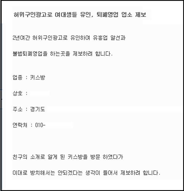 제보자는 "일하는 여성 대부분이 여대생이던데, '왜 이런 일을 하느냐' 물어보니까 학자금 대출을 갚기 위해서 한다고 하더라"면서 "이건 정말 아니다 싶어서 제보하게 됐다. 일단 거짓 구인광고부터 막는 게 시급해 보인다"고 강조했습니다.