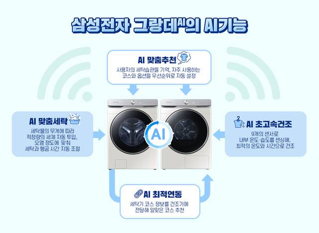 삼성전자에 따르면, 삼성 ‘그랑데 AI’는 이 번거로운 세탁의 과정을 쉽게 만드는 인공지능 기능을 탑재했다. 사용자 개개인의 사용 패턴을 기억하고 스스로 학습해 맞춤형 서비스를 제공한다.