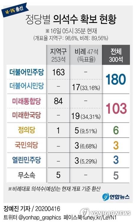 전국 개표율 99.3%를 기록한 16일 오전 6시 22분 더불어민주당과 비례정당 더불어시민당이 단독으로 180석의 의석을 확보하는 것으로 집계됐다.