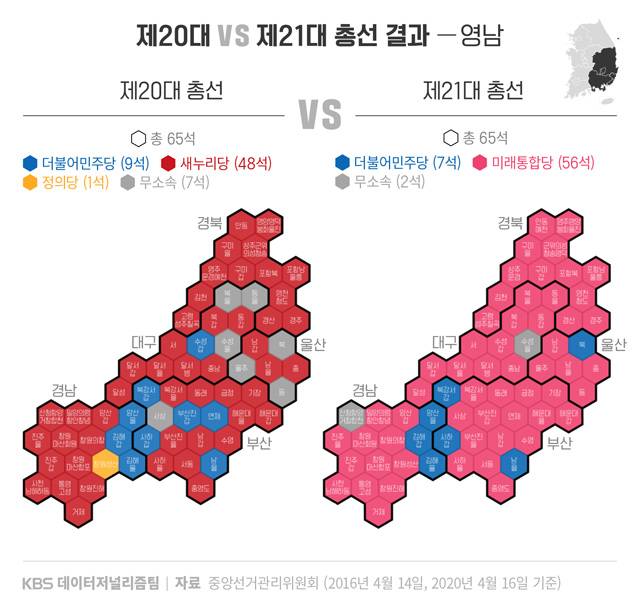 통합당은 정의당이 차지하던 창원성산 지역구에 깃발을 꽂는 등 경남의 16석 중 12석을 차지하며 존재감을 과시했고, 울산의 6개 의석 가운데 5석을 차지하며 이른바 '낙동강 벨트'(부산·울산·경남)를 핑크빛으로 물들였습니다.