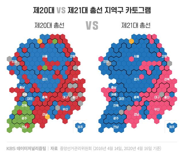KBS 데이터저널리즘팀은 인구 비례에 따른 선거 결과를 쉽게 알 수 있도록, 모든 지역구를 동일한 크기로 표현한 '카토그램' 지도를 제작했습니다.