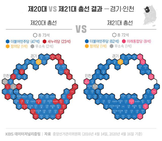 59개 의석이 달린 경기에서도 민주당의 확산세가 드러납니다. 민주당은 통합당 원내대표 심재철 후보의 지역구였던 안양 동안을에 당 대변인 출신 이재정 후보를 내세워 탈환에 성공했습니다. 이와 함께 민주당은 시흥갑, 안산 단원갑·을, 용인병 등에 새롭게 파란 깃발을 꽂으며 모두 51석을 차지했습니다. 20대 총선 때보다 11석을 늘린 수치입니다.