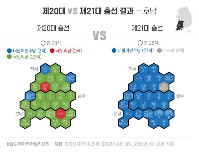 지난 총선에선 통합당의 전신인 새누리당이 전남과 전북에서 각각 1석씩을 확보해서 지역구도의 벽이 허물어지는 듯했지만, 이번 총선에선 지역주의의 벽은 더 공고해졌습니다. 지난 총선 호남 지역에서 23석을 차지했던 국민의당과 같은 제3정당의 돌풍도 연출되지 않았습니다.