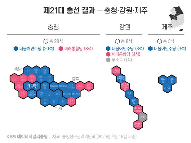 민주당은 28개 의석 중 20석을 확보하며 충청 지역의 71%를 파랗게 물들였습니다. 동(통합당)과 서(민주당)로 갈라졌던 대전은 민주당으로 통합됐고, 의석수가 1개에서 2개로 늘어난 세종시(갑·을) 역시 모두 민주당에서 당선자가 나왔습니다.