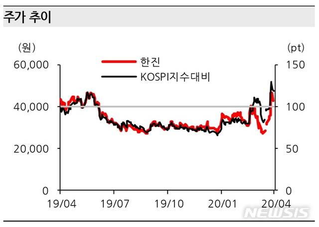 [서울=뉴시스] 김동현 기자 = 한화투자증권은 17일 한진(002320)에 대해 "신종 코로나바이러스 감염증(코로나19) 확산으로 온라인 소비가 집중되면서 1분기 호실적을 기록했다"며 투자의견을 매수, 목표주가로 5만4000원을 제시했다.
