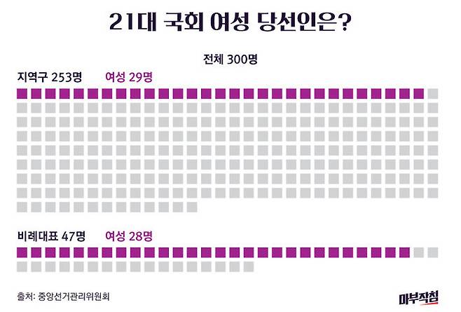 또 한 걸음 나갔지만 보폭은 좁다. 21대 국회의원 여성 당선인은 지역구 29명, 비례대표 28명, 합쳐서 57명이다. 당선인 300명 중 19.0%를 차지했다.
