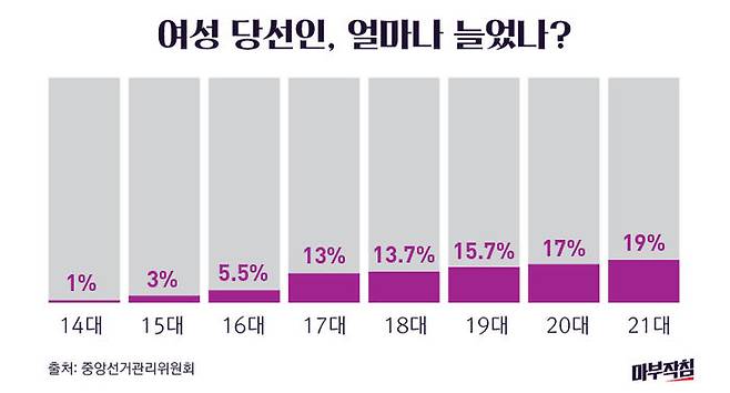 20대 국회는 17.0%, 51명이었다. 여성 의원 6명이 더 늘었다. 20대 국회에서 26명이었던 지역구 당선인이 29명이 됐고 25명이었던 비례대표는 28명으로 증가했다. 둘 다 역대 최대 규모다. (비례대표는 19대에서도 28명이었는데 당시엔 전체 비례대표가 54명으로 지금 47명보다 많았다.)