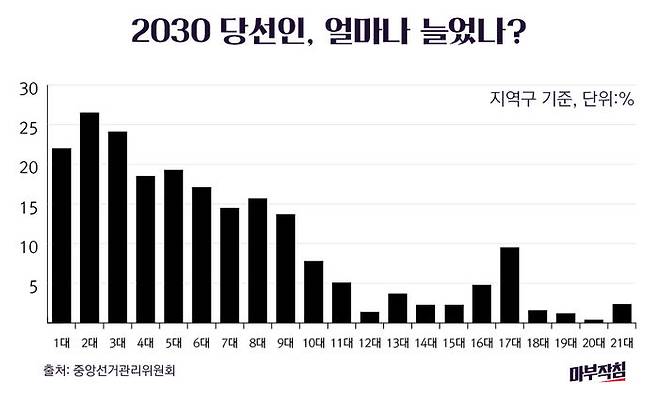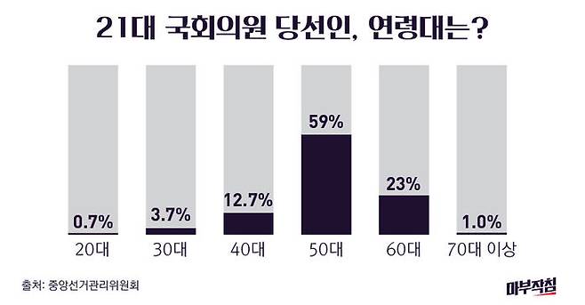 지역구 기준으로 보면 2030 비중이 가장 컸던 건 한국전쟁 직전 1950년에 구성된 2대 국회다. 당시 30대 이하 의원들이 26.5%나 됐던 반면, 60대 이상은 10.3%에 불과했다. 1954년 3대 국회에선 역대 최연소 의원으로 기록된 고 김영삼 전 대통령이 당선됐는데(26세) 30대 이하 비율은 24.1%였다. 1979년 10대 국회 이후 2030 의원 비율이 10%를 넘은 일은 없었다. 앞서 언급했던 17대 총선에서도 9.5%가 최대였다.(지역구) 반면 60대 이상 비율은 1992년 14대 총선부터 10%를 넘어서더니 지난 20대 총선에서 27.7%로 가장 높았다.(지역구) 이번 21대 총선에선 지역구의 60대 이상 비율은 24.5%로 30대 이하의 10배에 이른다.(비례까지 합하면 약 6배.)