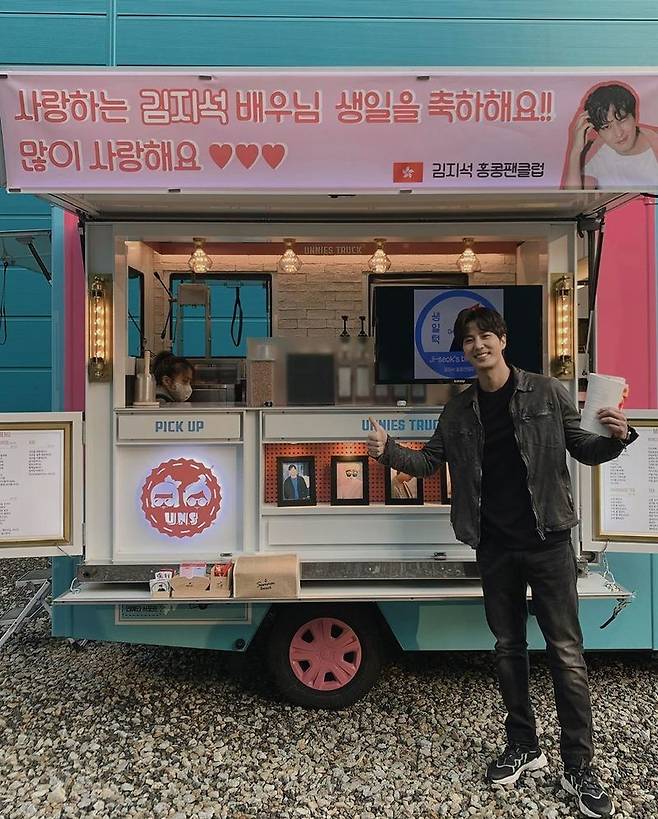 사진 속에는 홍콩팬클럽이 선물한 커피차 앞에 선 김지석의 모습이 담겼다. 김지석은 엄지척 포즈를 취한 채 미소짓고 있다. 김지석의 잘생긴 비주얼이 시선을 사로잡는다.