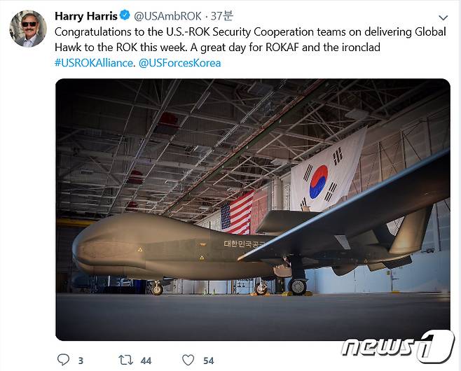 해리 해리스 주한미국대사는 19일 트위터에 "이번 주 한국에 글로벌호크를 인도한 미·한 안보협력팀에 축하한다"며 "한국공군과 철통같은 미한동맹에 매우 좋은 날"이라고 밝혔다.(해리 해리스 주한미국대사 트위터 캡처) 2020.4.19/뉴스1