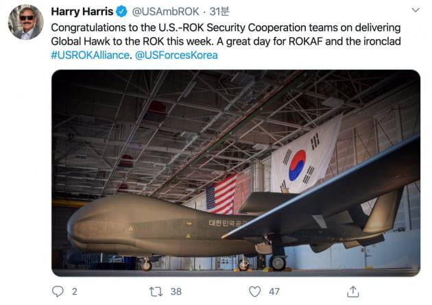 해리 해리스 주한미국대사는 19일 트위터에 '대한민국공군'이 새겨진 글로벌호크가 성조기와 태극기가 걸린 격납고에 있는 사진을 공개하며 "이번 주 한국에 글로벌호크를 인도한 미·한 안보협력팀에 축하한다. 한국공군과 철통같은 한미동맹에 매우 좋은 날"이라고 밝혔다.