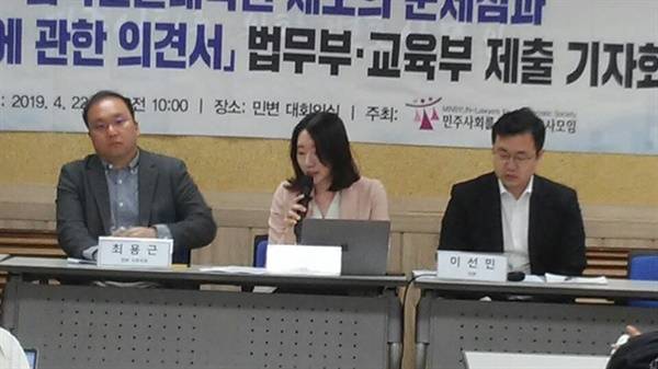 | ▲ 지난해 4월, 민변?참여연대?경실련 등의 우리사회의 상징적인 진보적 시민단체들도 이를 지지하며 ‘변호사시험을 자격시험으로 운영하라’는 의견서 및 성명서를 발표했다. 사진은 민변의 해당 의견서 제출 관련 기자회견 모습. |