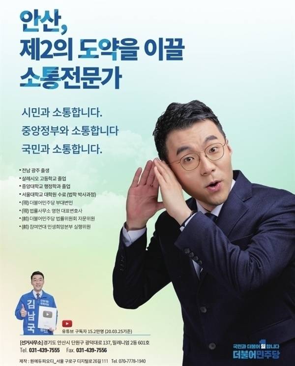 | ▲ 이번 4.15총선에서 당선된 민주당의 김남국 안산 단원을 당선자의 선거 포스터. 학력 기재 공간에 출신 고등학교, 대학교, 박사학위를 받은 대학원 등이 기재되어 있으나, 그의 직업 '변호사'와 직접 관계된 '전남대 로스쿨 (1기)'만은 빠져 있다. |