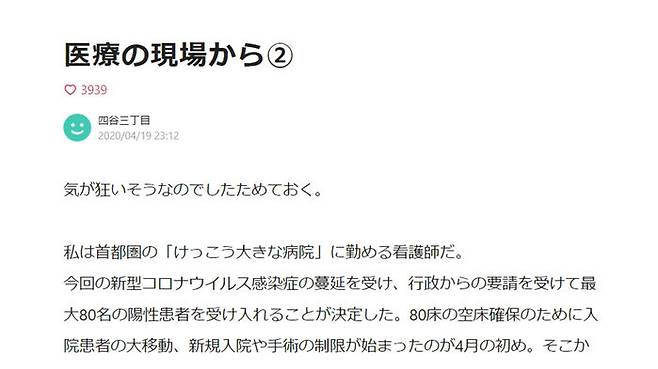 그런 가운데, 일본의 SNS에 조용히 퍼지는 글을 접했습니다. 그제(19일) 한 블로그 사이트에 올라온 글입니다. '요츠야 산초메(도쿄의 주소명)'라는 필명을 쓰는 글쓴이는 자신을 수도권의 '꽤 큰 병원'에 근무하고 있는 간호사라고 소개하며, 본인이 근무하는 병원의 상황을 설명합니다. 글에는 '코로나19 지정대응병원'이 된 직장의 현실과, 의도적이든 아니든 결과적으로는 현장을 외면하고 있는 언론의 실태와, 이 와중에도 현장을 제대로 지원하지 않고 표정 관리에만 바쁜 정치권에 대한 비난까지 고스란히 담겨 있습니다.