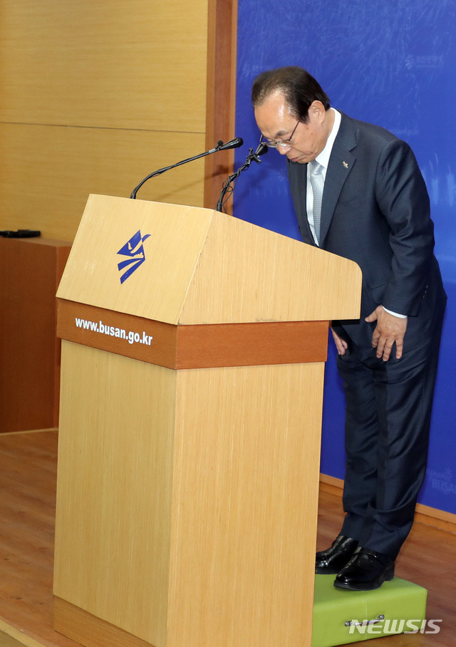 머리 숙인 오거돈 부산시장