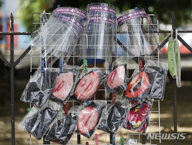 [마닐라=AP/뉴시스]23일(현지시간) 필리핀 마닐라에서 신종 코로나바이러스 감염증(코로나19) 확산을 막기 위한 검역이 강화된 가운데 플라스틱 안면 가리개와 다양한 디자인의 마스크가 판매되고 있다. 필리핀의 코로나19 누적 확진자는 6599명, 사망은 437명으로 집계됐다. 2020.04.23.