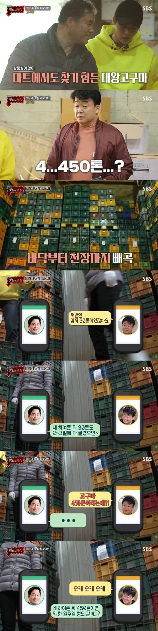 이어 눈으로 고구마 450톤을 확인한 백종원은 구석에서 몰래 신세계 정용진 부회장에게 전화를 걸어 "저번에는 감자 30톤이었는데 이번에는 고구마다. 고구마가 좋은데 커서 안 팔린다"고 말했다.