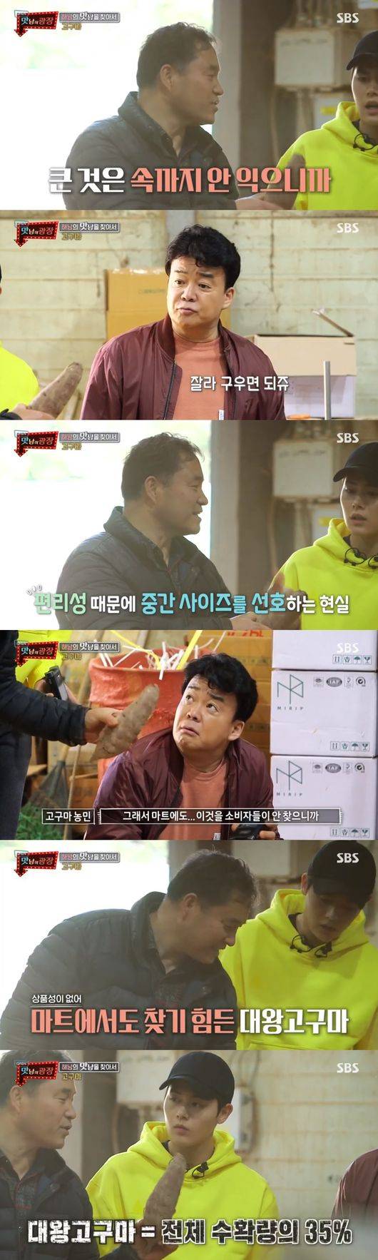 이어 농민은 "작년에 비가 많이 와서 고구마가 풍년이다. 그러니까 이렇게 사이즈가 커지는 거다"라고 말했다. 농민은 대왕고구마가 450톤 있다고 밝혀 주위를 깜짝 놀라게 만들었다. 백종원은 450톤이라는 말에 기가 막혀 했다.