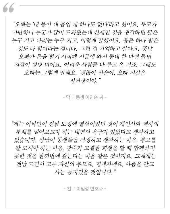 민주당 당원으로서 권력에 대한 저항 정신을 가르치고 원칙을 강조했던 아버지와 새벽부터 왕복 5㎞ 거리를 오가며 채소를 팔아 7남매를 키웠던 어머니. 어린 그의 가능성을 알아보고 ‘반드시 광주 중학교로 진학해야 한다’며 회초리 들어 공부를 시켰던, 낯선 유학 생활 중 제자의 어려운 가정 형편을 알고는 때때로 고기를 먹여줬던 은사들. 이낙연의 역사가 이낙연 만의 역사가 아닌 또 다른 이유일 겁니다.