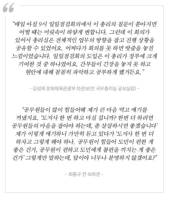 “공부하는 것도 그렇고, 어떤 문제를 풀기 위해서도 그렇고 끝까지 치열한데 이걸 두고 ‘정성’이라고 표현합니다. 이 전 총리는 얼마나 정성을 기울이는지에 따라 문제가 어떻게 될지 판가름 난다고 생각하고, 끝까지 최선을 다해요. 최선을 다하는 모습이 단지 최선을 다한다고 표현하기에는 아주 많이 부족할 정도로. 이 전 총리는 ‘온 힘을 다한다’ 또는 ‘몸부림친다’라고도 말했죠.”