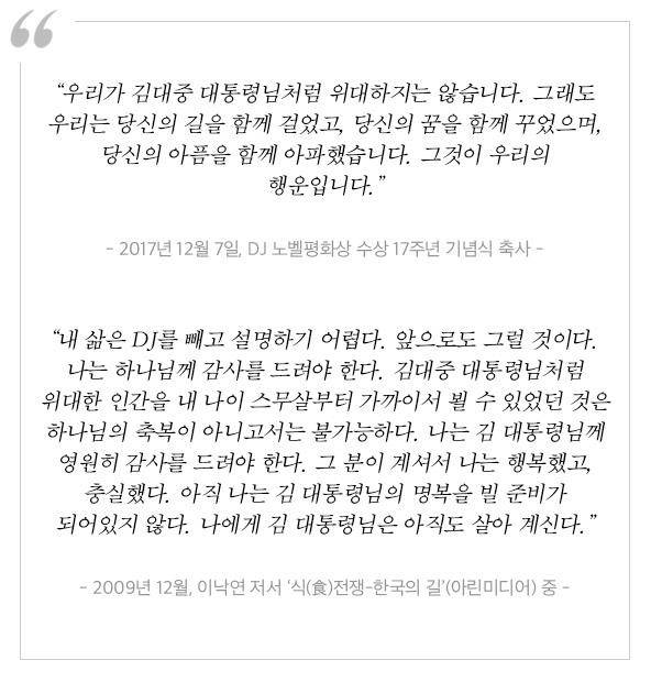 “제가 볼 때 DJ는 이 전 총리에게 아버지 같은 사람이에요. 피로 만난 아버지가 있다면 DJ는 철학과 가슴으로 만난 아버지라 할까요. DJ가 보여 준 호남 특유의 해학과 풍류, 역사 의식과 저항 정신까지 모든 것이 이낙연이란 인물 안에 있는 것 같아요. 그 분 같은 지도자가 되고 싶다는 열망도 보여요. DJ의 ‘서생적 문제의식과 상인적 현실감각’을 늘 새기며 균형을 맞추려 하죠. DJ의 또 다른 명언 ‘인생은 아름답고 역사는 발전한다’도 마찬가지예요. 그 자리에 가만히 있는 듯 보이지만 이 전 총리 개인과 대한민국도 앞으로 계속 나아간다고 생각하는 것 같아요.”