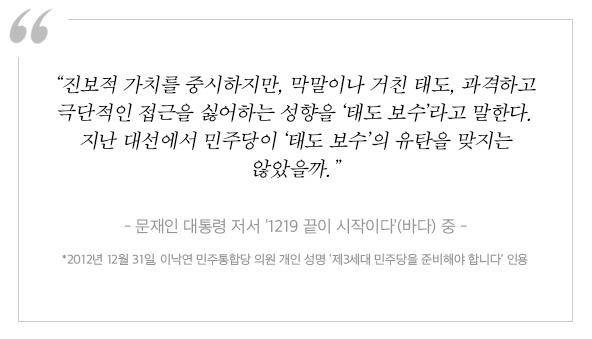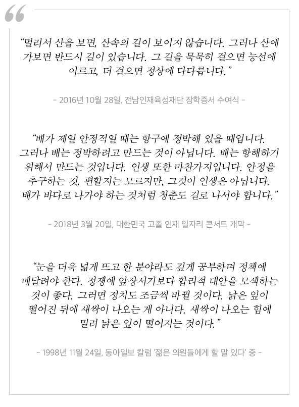“김대중의 역사의식과 만났고, 노무현에게서는 정치적 돌파력을 배웠고, 문재인과는 손을 잡고 소리 없이 변화를 만들고 있다. 그렇지 않을까요.”