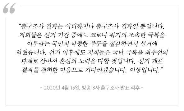 민주당이 180석을 얻으며 압도적 승리를 거둔 4ㆍ15 총선에서 많은 사람들의 눈길을 받았던 장면이 있었죠. 지상파 방송 3사가 출구조사 결과를 발표한 그 순간 이 전 총리의 모습이었습니다. 상황실에 모였던 당 지도부, 후보자, 관계자들이 발표와 동시에 자동 반사적으로 박수를 치거나 탄성을 터뜨렸는데요. 서울 종로 후보이자 상임선거대책위원장을 맡은 이 전 총리는 동요하지 않고 즉시 두 팔을 벌려 자제하라는 신호를 줍니다. 그리고는 낮은 목소리로 이렇게 말하죠. “출구조사 결과는 어디까지나 출구조사 결과일 뿐입니다.”