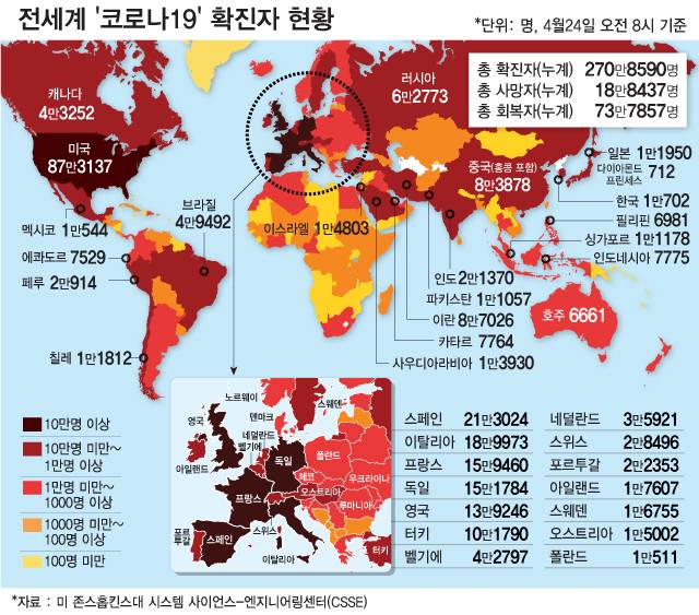 24일 한국시간 오전 8시 기준 미국 존스홉킨스대학 통계에 따르면 전세계 코로나19 누적 확진자는 270만8590명으로 집계됐다. 사망자는 18만8437명, 회복자는 73만7857명을 기록했다.