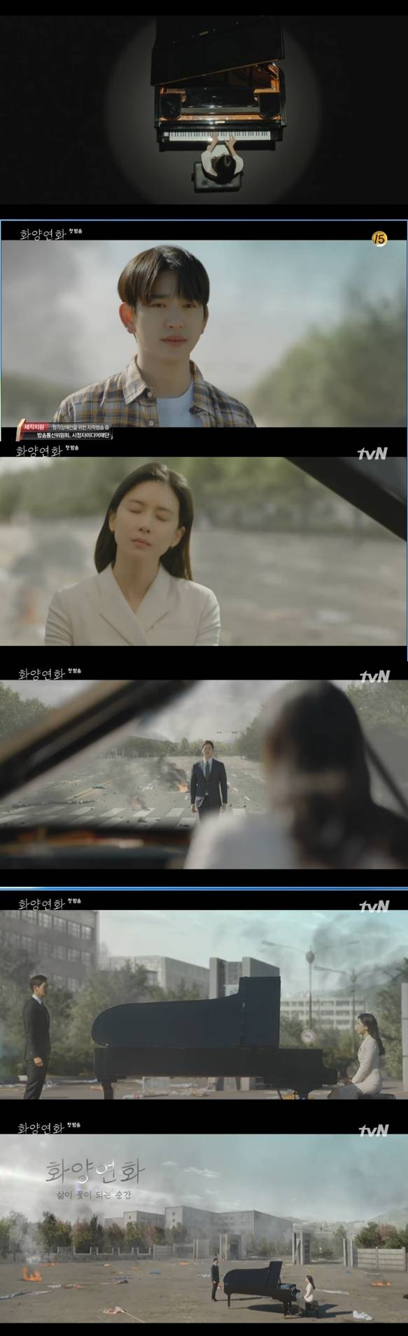 25일 밤 바옹된 tvN 토일 드라마 '화양연화'에서는 시간이 흘러 도시 한가운데서 피아노를 사이에 두고 서로를 바라보는 윤지수(이보영 분)과 한재현(유지태 분)의 모습이 나왔다.