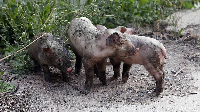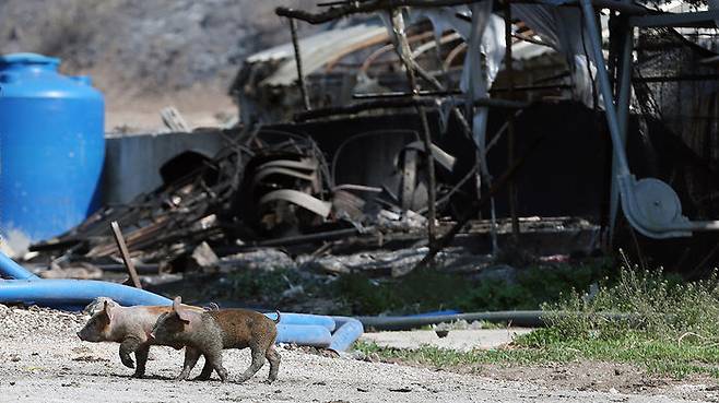 산불 피해를 본 한 양돈장에서 불을 피해 살아난 새끼돼지들이 돌아다니고 있다.