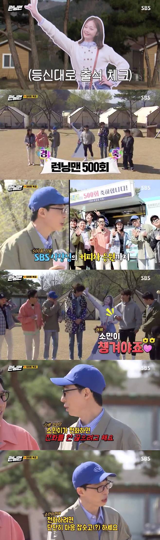 이에 김종국은 "외로워하기 때문에 챙겨야 한다. 혼자 500회인데 못 오고 있어서 외로울 거다"라며 전소민을 걱정했다.