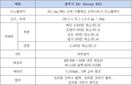 갤럭시 A31은 접사까지 지원하는 쿼드 카메라와 5000mAh 대용량 배터리가 탑재됐다.