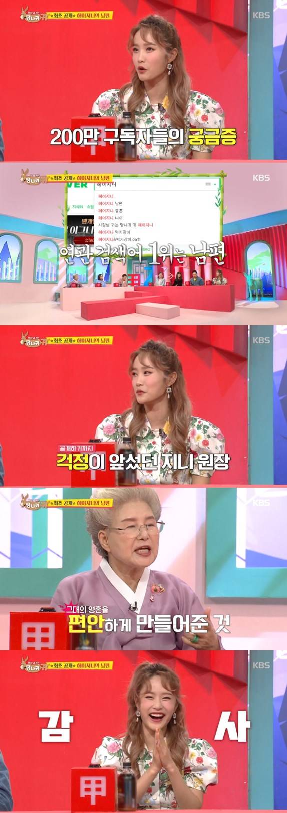 헤이지니는 “제 남편이 늘 관련 검색어에 뜬다. 그런데 공개하기가 부끄럽더라”고 하자 심영순은 “내가 그대의 마음을 편안하게 한 거다”라고 말해 웃음을 자아냈다.