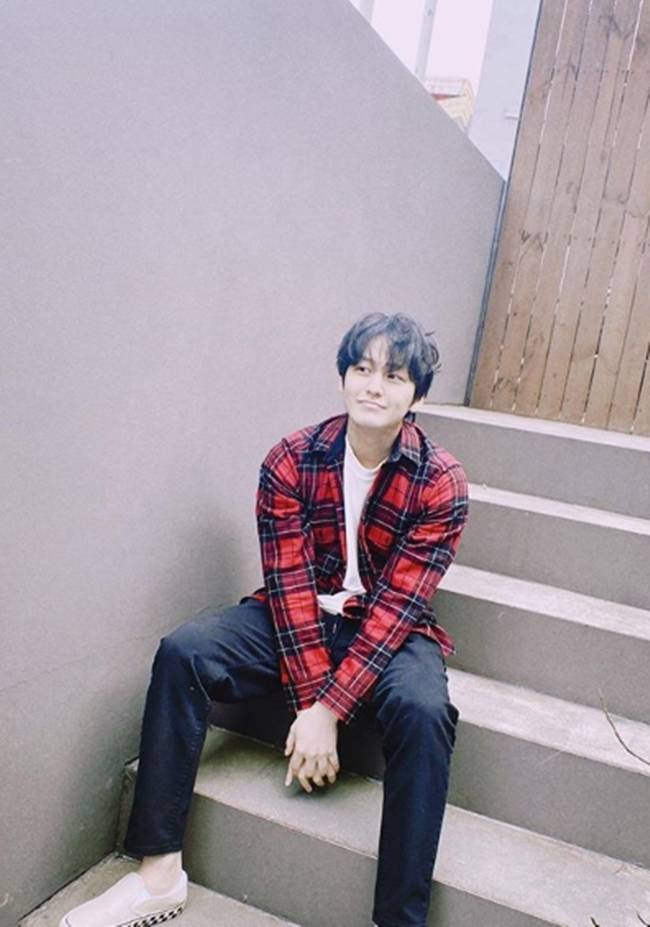사진 속 김범은 계단에 걸터앉은 채 카메라를 향해 한껏 여유로운 미소를 뽐내고 있다.