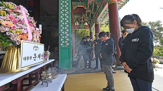 28일 오전 충남 아산시 현충사에서 열린 충무공 이순신 장군 탄신 제475주년 기념행사에 참석한 현충사 문화유산(위토) 지킴이단 대표들이 묵념하고 있다.
