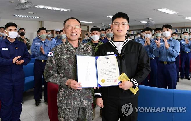 (서울=연합뉴스) 동해 군사대비태세 현장 점검을 위해 1함대사령부를 찾은 부석종 해군참모총장(왼쪽)이 28일 수병들과의 간담회에 앞서 식자재 위생 관리와 장병 면역력 향상에 기여한 심형우 상병(오른쪽, 해상병 655)에게 표창을 수여하고 있다. 2020.4.28